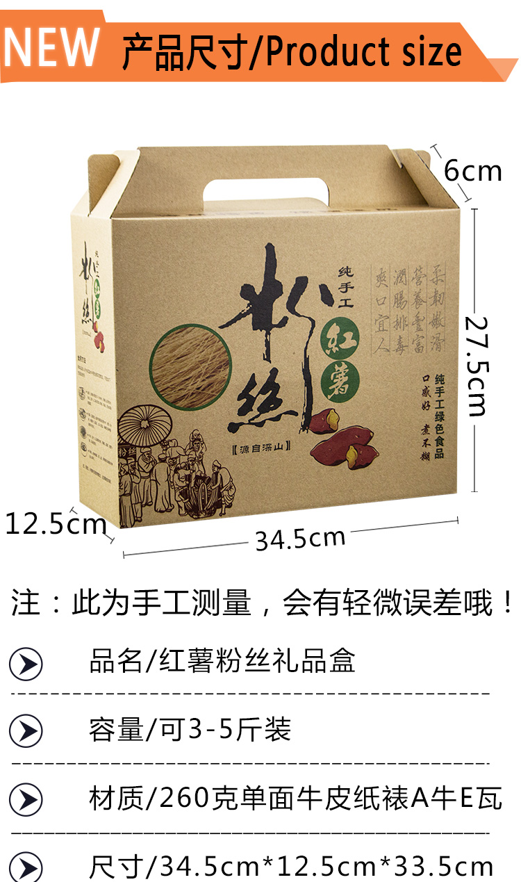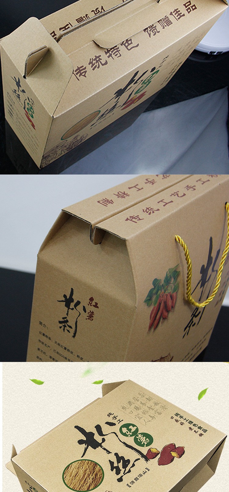 紅薯粉包裝盒是選用牛皮紙瓦楞盒,美航包裝免費為客戶提供多種包裝盒設計方案,客戶最后選擇的紅薯粉包裝盒設計為簡約風格,實體紅薯粉圖片突出產品純野生、無污染、好品質、無添加的特色!紅薯粉包裝盒外觀簡潔大方,并自帶提手,既便于客戶攜帶,又能達到節約成本的目的。 此款包裝盒解決了紅薯粉不易攜帶的問題,大大增加了紅薯粉銷量,客戶對此款紅薯粉包裝盒非常滿意,愿與湖南美航包裝達成長期的合作協議!