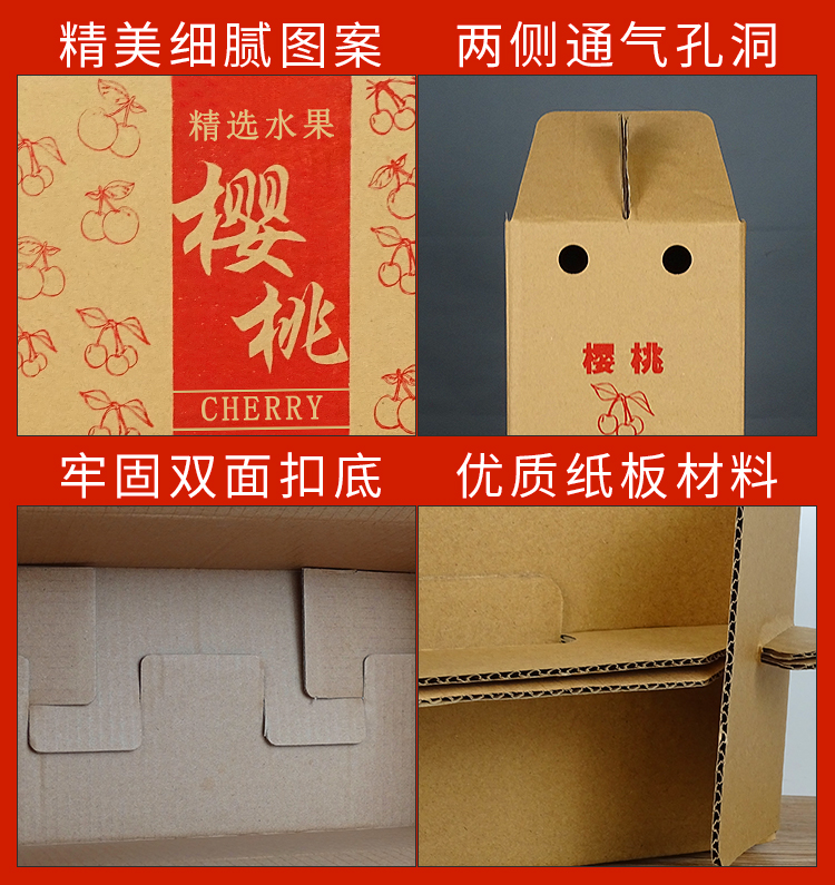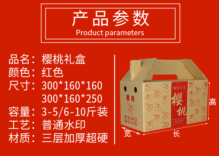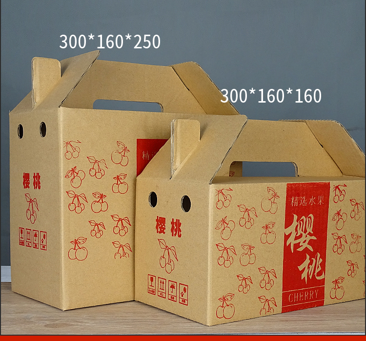 櫻桃包裝盒是選用自帶提手瓦楞盒,美航包裝免費為客戶提供多種包裝盒設計方案,客戶最后選擇的櫻桃包裝盒設計為簡約水墨風格,突出產品豐盈飽滿、汁多味甜特點!櫻桃包裝盒外觀簡潔大方,并自帶提手,既便于客戶攜帶,又能達到節約成本的目的。側邊開有通氣孔,保證櫻桃能正常呼吸。 此款包裝盒解決了櫻桃不易攜帶的問題,大大增加了櫻桃銷量,客戶對此款櫻桃包裝盒非常滿意,愿與湖南美航包裝達成長期的合作協議!