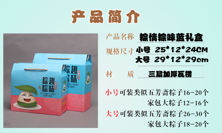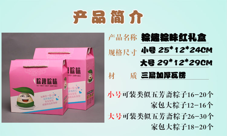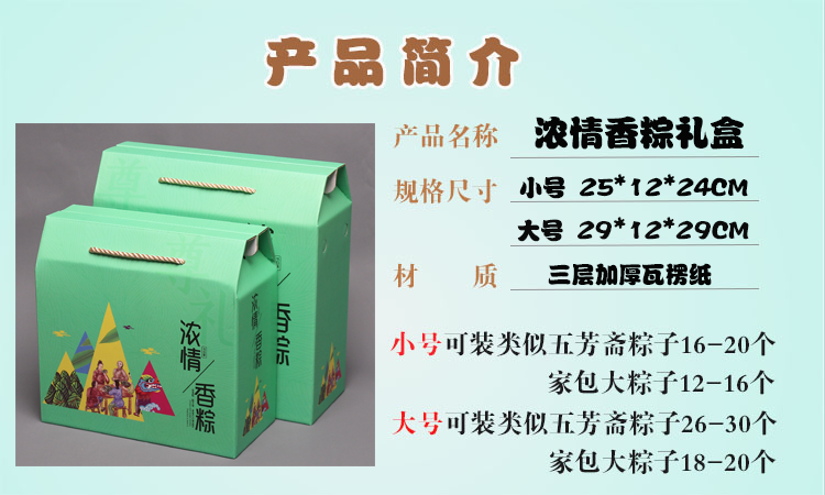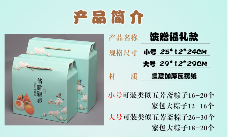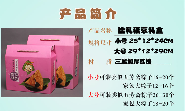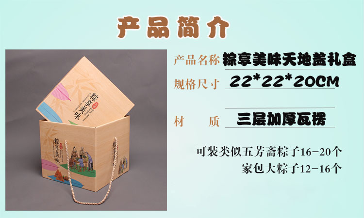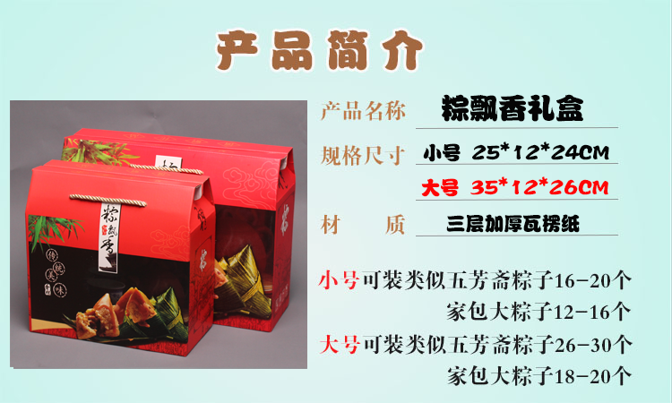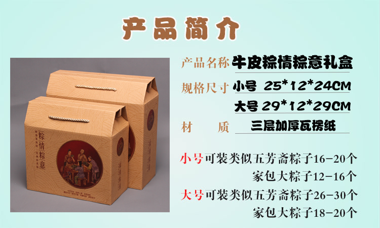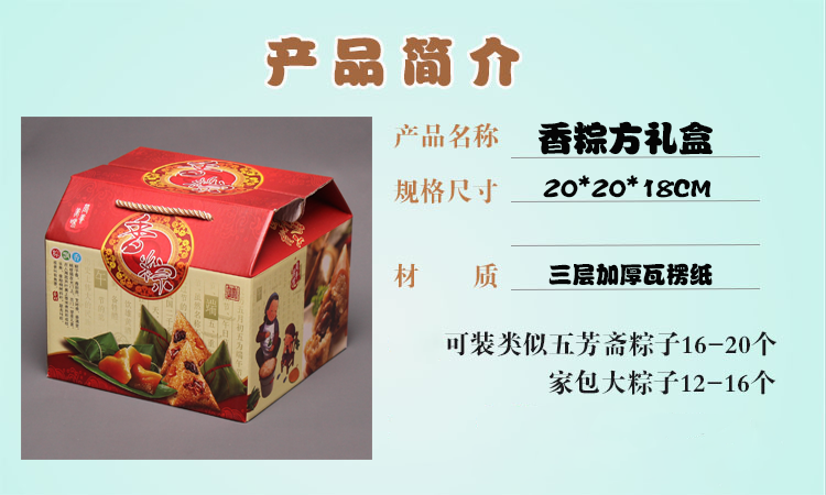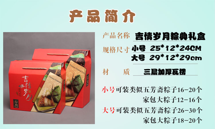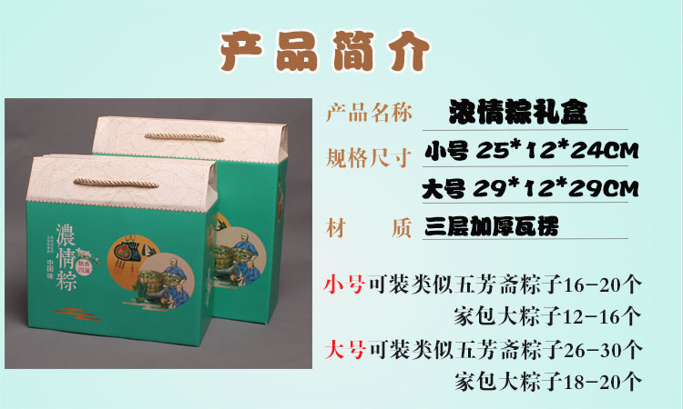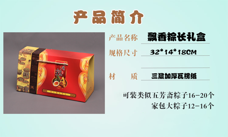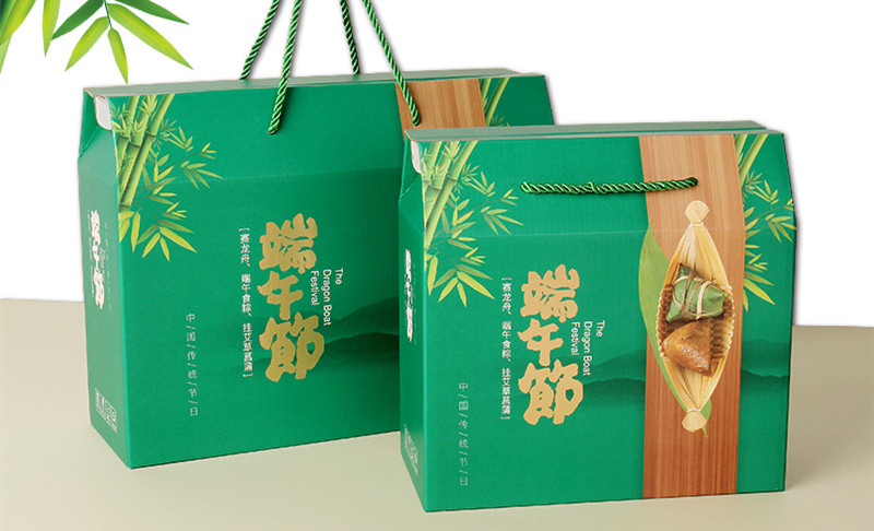 粽子包裝禮盒是選用手提繩瓦楞盒,美航包裝免費(fèi)為客戶提供多種包裝禮盒設(shè)計方案供選擇,有以大紅色為主色調(diào),突出禮品定位,契合過節(jié)的喜慶氣氛。有以綠色為主色調(diào),突出粽葉的主題。粽子包裝禮盒外觀喜慶大方,并自帶手提繩,便于客戶攜帶、方便堆碼。此款包裝禮盒喜慶大方,提升禮品檔次,大大增加了粽子銷量,客戶對此款粽子包裝禮盒非常滿意,愿與湖南美航包裝達(dá)成長期的合作協(xié)議!
