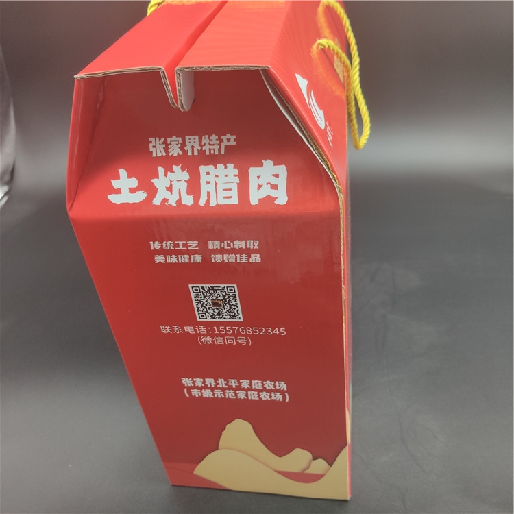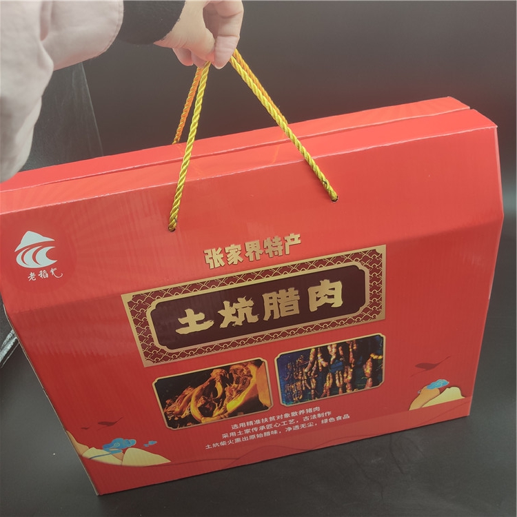 這是一款長沙特產禮盒,采用白卡紙印刷覆膜裱瓦楞紙,盒子是大紅色斜坡瓦楞盒,簡單大氣,承重能力強;盒子自帶手提繩,方便攜帶。